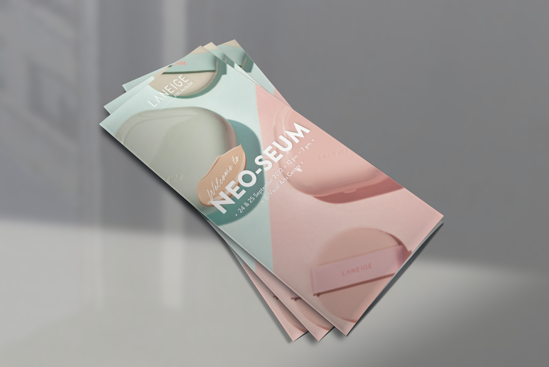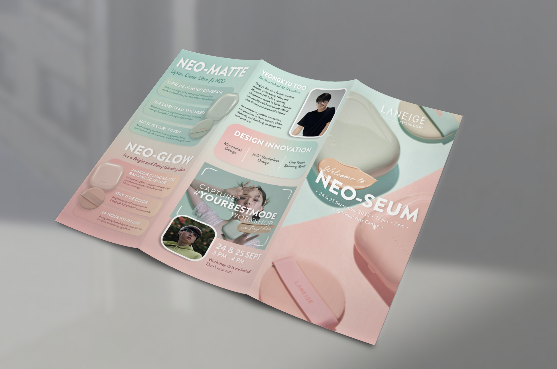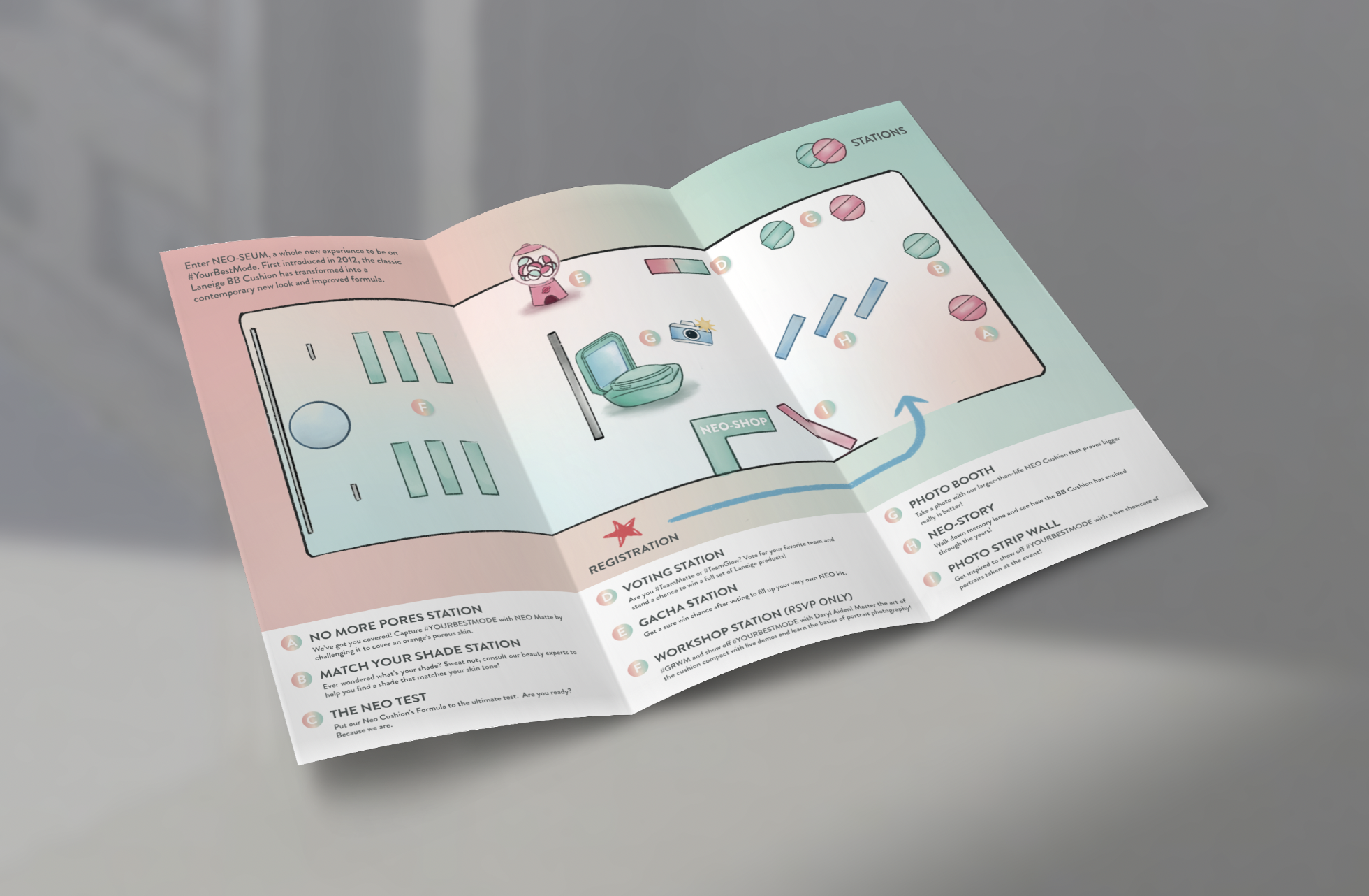 The weekend-long NEO-SEUM experiential journey saw Laneige unveil the latest iteration of their ever-popular NEO Cushion product line. Participants received a pamphlet detailing the various experiential zones at the venue and introducing the new and improved product line. Everything from the layout to the copywriting was done by us!